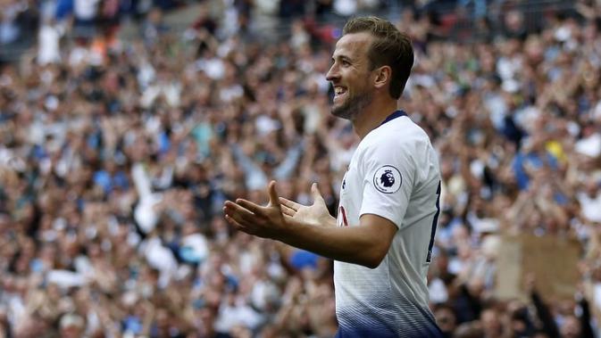 London - Striker Tottenham Hotspur, Harry Kane, menceploskan satu gol saat timnya menang 3-1 atas Fulham pada lanjutan Premier League, di Stadion Wembley, London, Sabtu (18/8/2018).