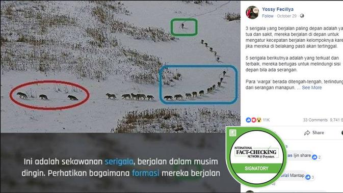 Liputan6.com, Jakarta - Sebuah foto yang menampilkan sekawanan serigala sedang berjalan di salju yang tebal sedang viral di Facebook. Dalam foto tersebut, kawanan serigala tersebut berjalan dalam satu baris, dengan 3 ekor serigala terlihat memimpin kawanan di depan dan satu ekor serigala terlihat mengawal di belakang.