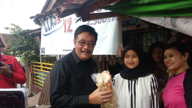 Rupanya, toko di seberang tak mau ketinggalan. Djarot menyempatkan diri berfoto dengan perempuan muda dan ibu penjual. Dia tak ketinggalan membeli satu plastik kerupuk seblak.
