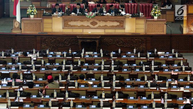Suasana Rapat Paripurna DPR di Jakarta, Senin (3/12). Selain mensahkan RUU SSKCKR, rapat juga mengambil keputusan terkait RUU Usul Inisiatif Anggota tentang Migas, RUU Larangan Minuman Beralkohol dan RUU tentang Pertembakauan. (Liputan6.com/JohanTallo)