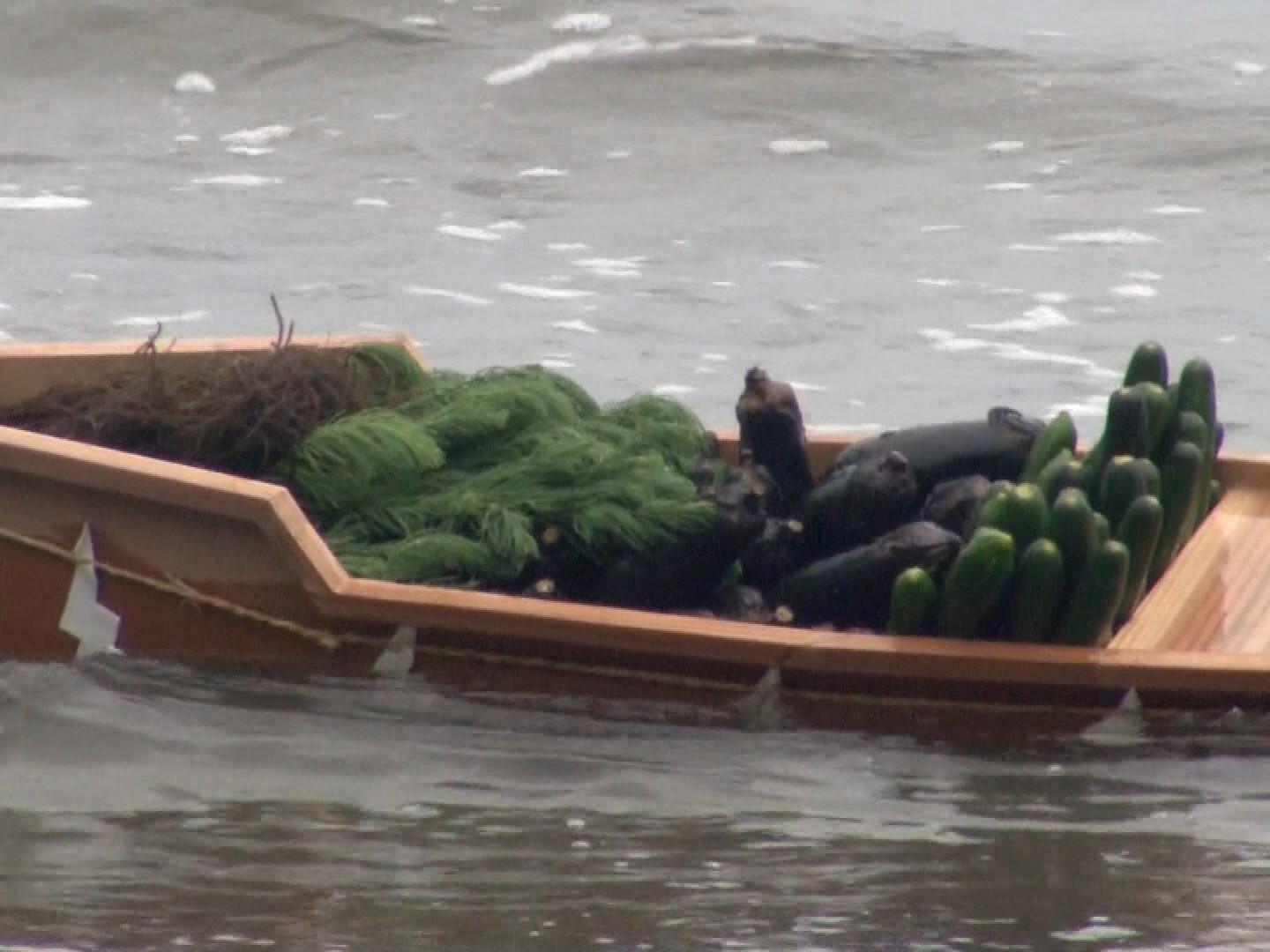 お供え物には、「津波が急にきたら見るな・待つな・おごるな」の語呂合わせで「キュウリ」、「ナス」、「マツナ」や「ミル」、「オゴ」といった海藻が選ばれているということです。