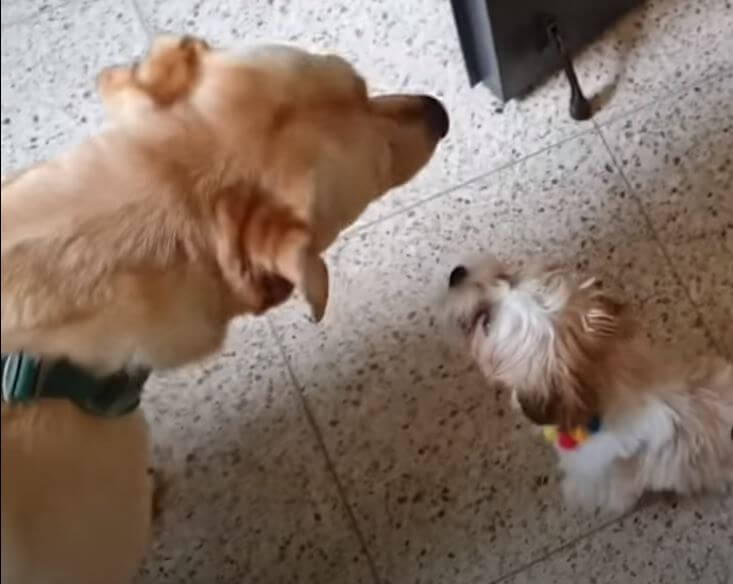 ラブがオーナーさんと訪問した先には小型犬がいました。家から飛び出してきた相手に、フレンドリーに挨拶しています。