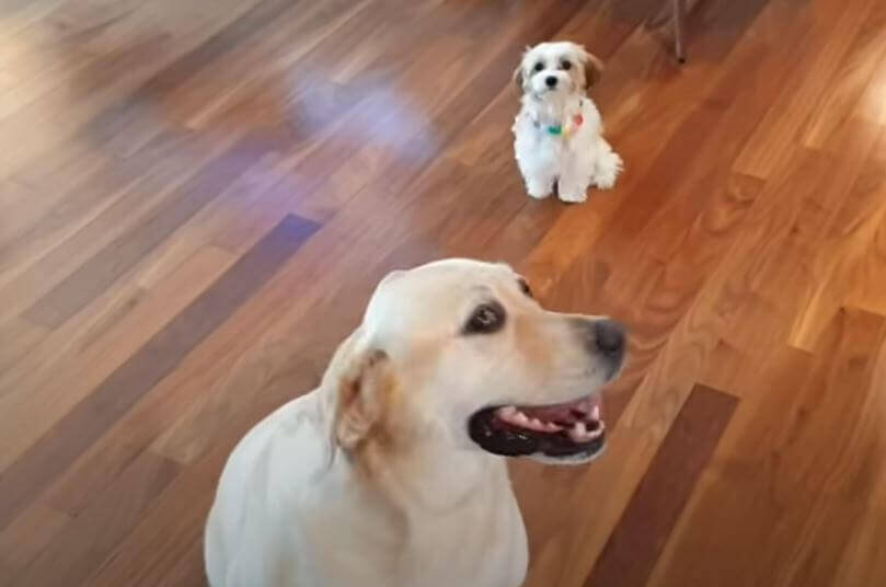 そして小型犬が「入って」とばかりに先導すると、ラブは我先にと家のなかへ。